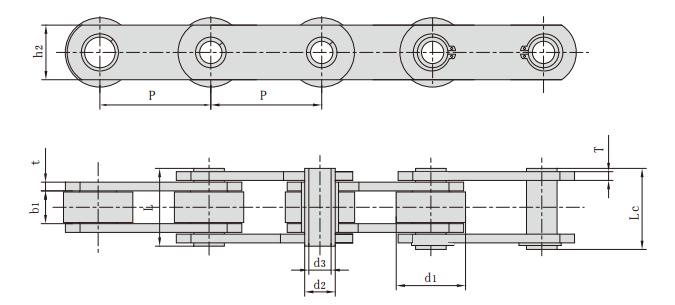 鏈號 節(jié)距 滾子直徑 內(nèi)節(jié)內(nèi)寬 銷軸直徑 銷軸長度 內(nèi)鏈板高度 鏈板厚度 抗拉強度 平均抗拉強度 每米長重